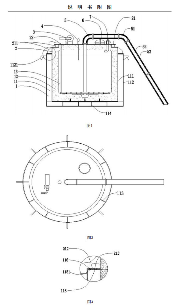 包體1、包蓋體2、引射器3、熱電偶溫度感應(yīng)器4、吸鋁管5、人孔6、進氣管7、包板11、包襯12、電加熱組件13、包蓋21、包蓋襯22、加強筋211、內(nèi)包板111、外包板112、加強板113、掛鉤1121、方管114、法蘭邊115、密封圈116、環(huán)形凹槽1151、法蘭邊212、第二環(huán)形凹槽213、彎頭管51、直管52、保溫層53。